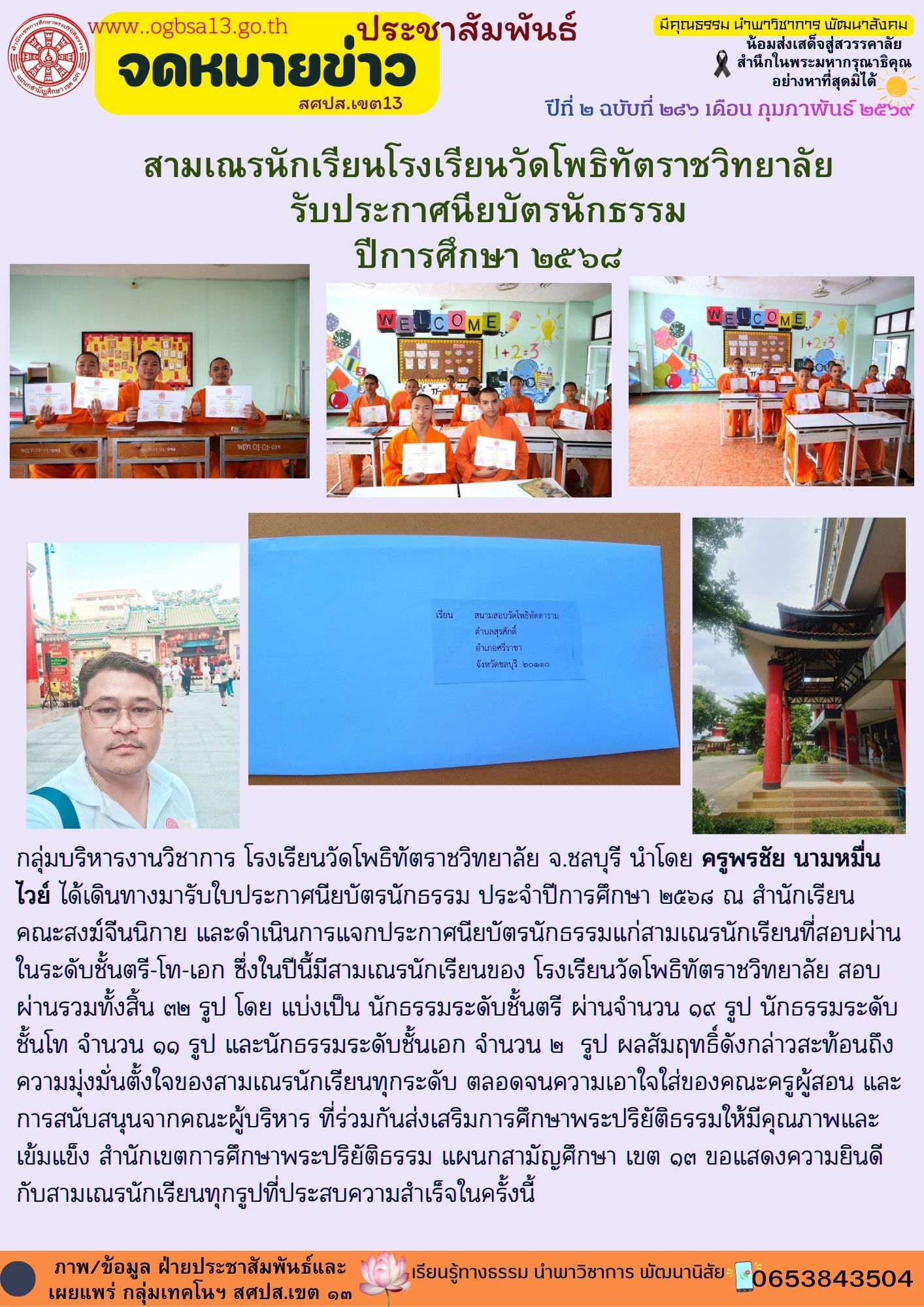 สามเณรนักเรียนโรงเรียนวัดโพธิทัตราชวิทยาลัย รับประกาศนียบัตรนักธรรม ปีการศึกษา ๒๕๖๘