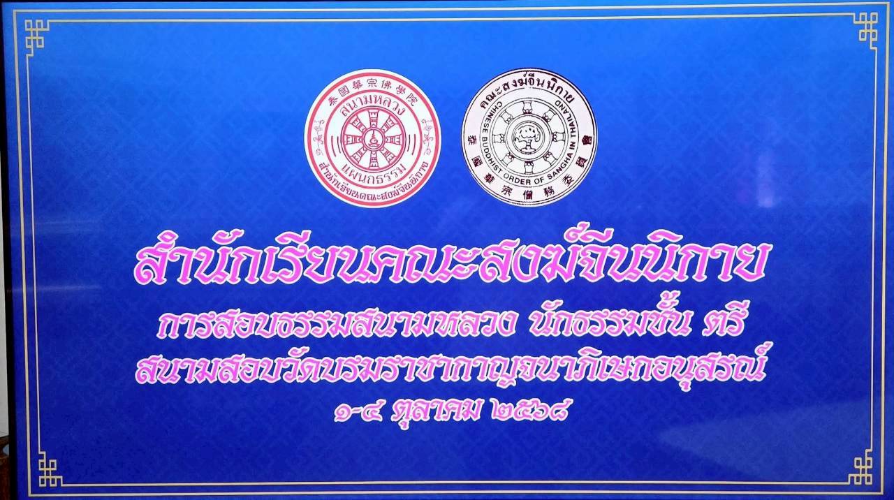 วันพุธที่ ๑ ตุลาคม ๒๕๖๘ นักวิชาการศาสนา ได้รับมอบหมายจาก ประธานเขต หลวงจีนสมุห์มงคลรัตน์, ดร. ฉายาเสี่ยมุ่ย ให้ร่วมงานพิธีเปิด การสอบธรรมสนามหลวง นักธรรมชั้นตรี สำนักเรียนคณะสงฆ์จีนนิกาย ระหว่างวันที่ ๑-๔ ตุลาคม ๒๕๖๘ ณ สนามสอบโรงเรียนมังกรกมลาวาสวิทยาลัย วัดบรมราชากาญจนาภิเษกอนุสรณ์ฯ บางบัวทอง จ.นนทบุรี โดยมี หลวงจีนธรรมนาทจีนประพันธ์ ที่ปรึกษาด้านการศึกษา คณะสงฆ์จีนนิกายเป็นผู้แทนเปิดการสอบธรรมสนามหลวงและอ่านคำปราศัยแม่กองธรรมสนามหลวง