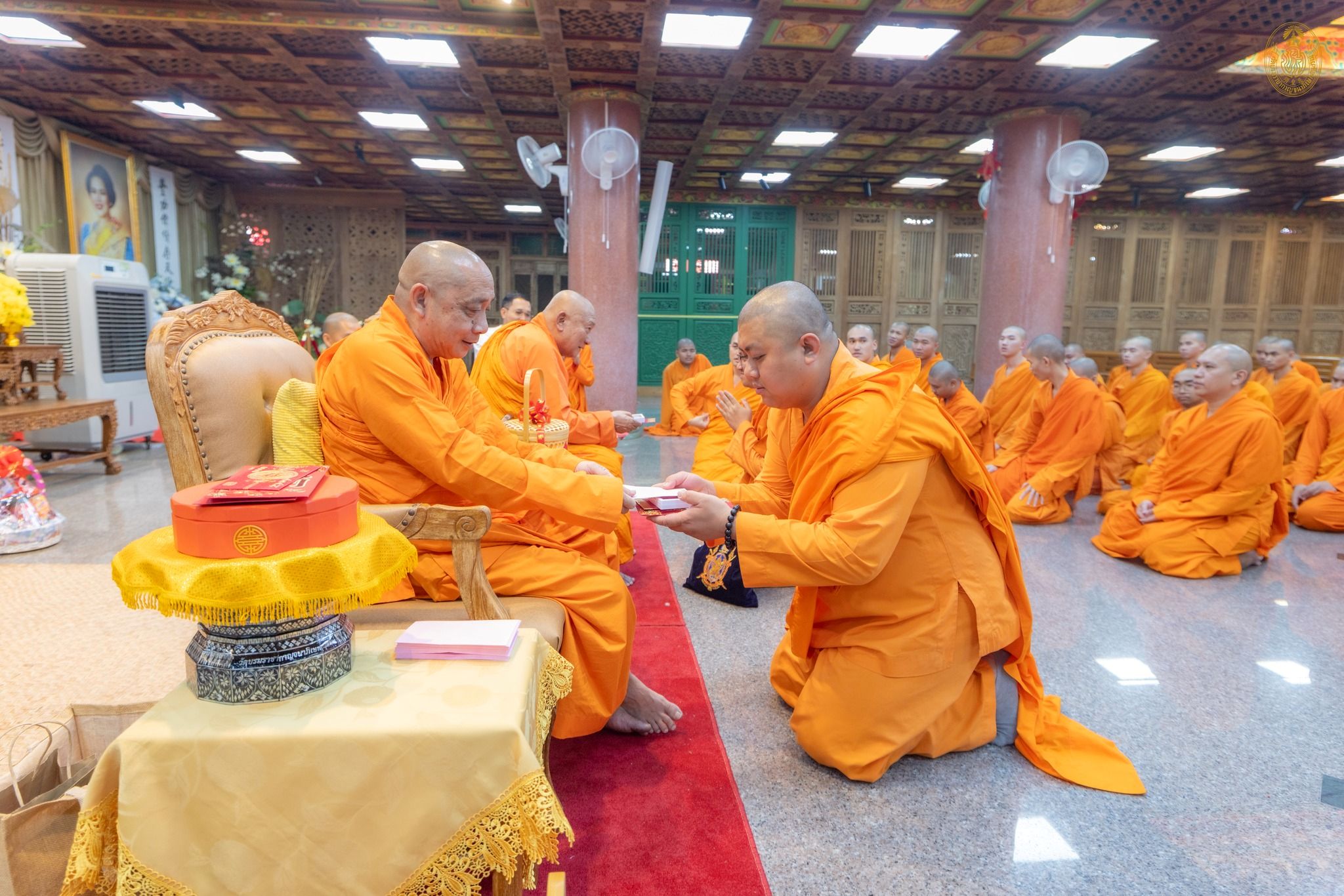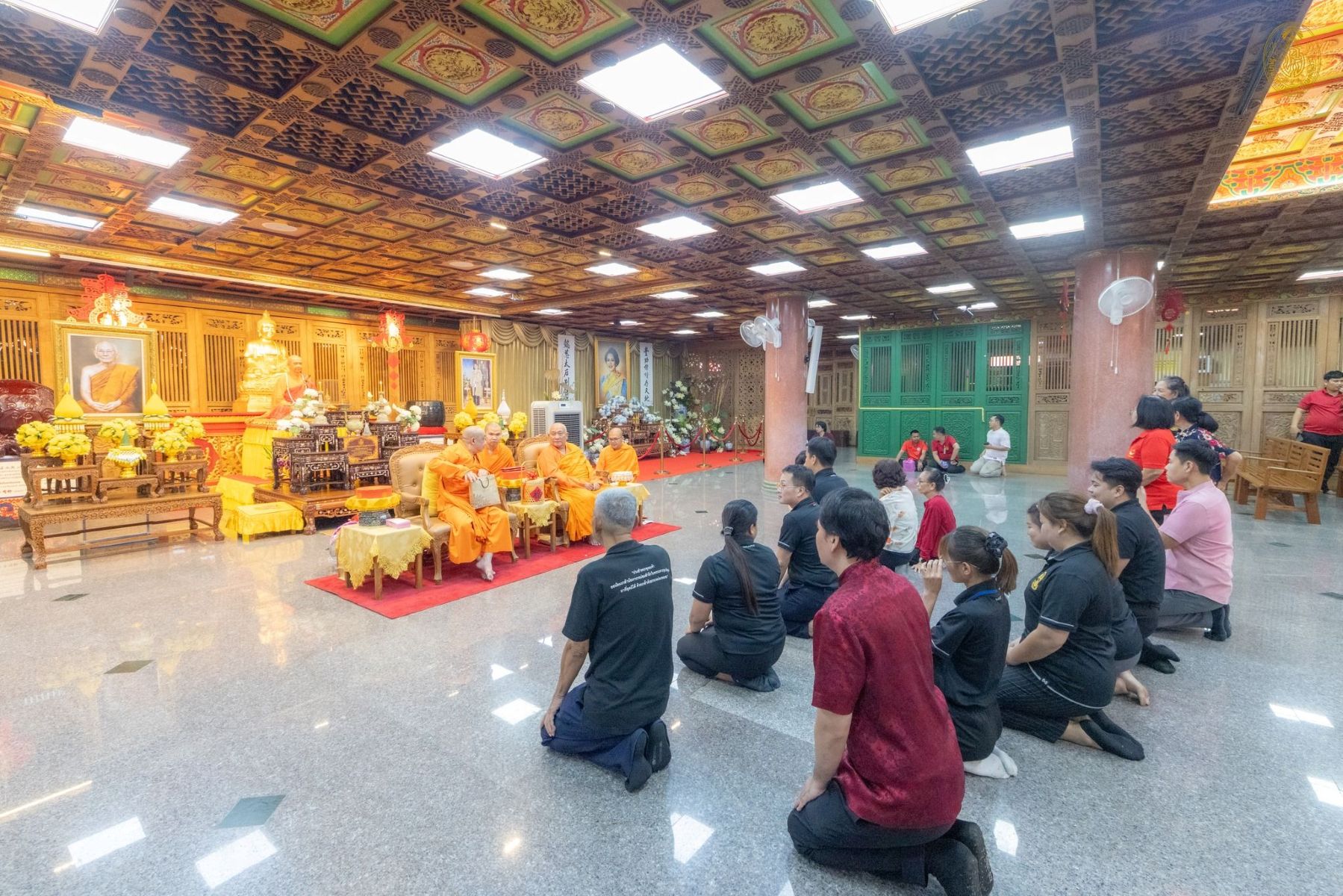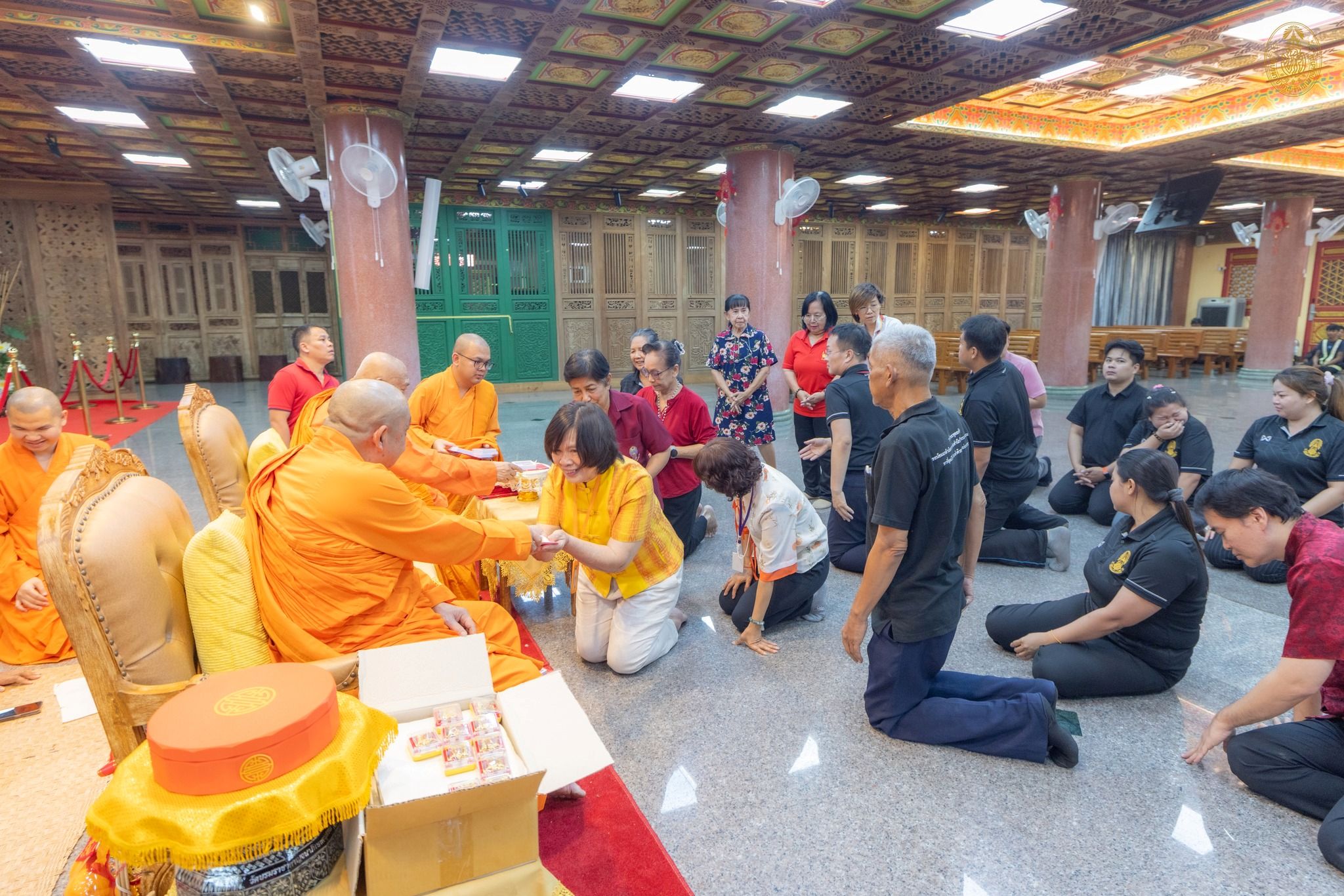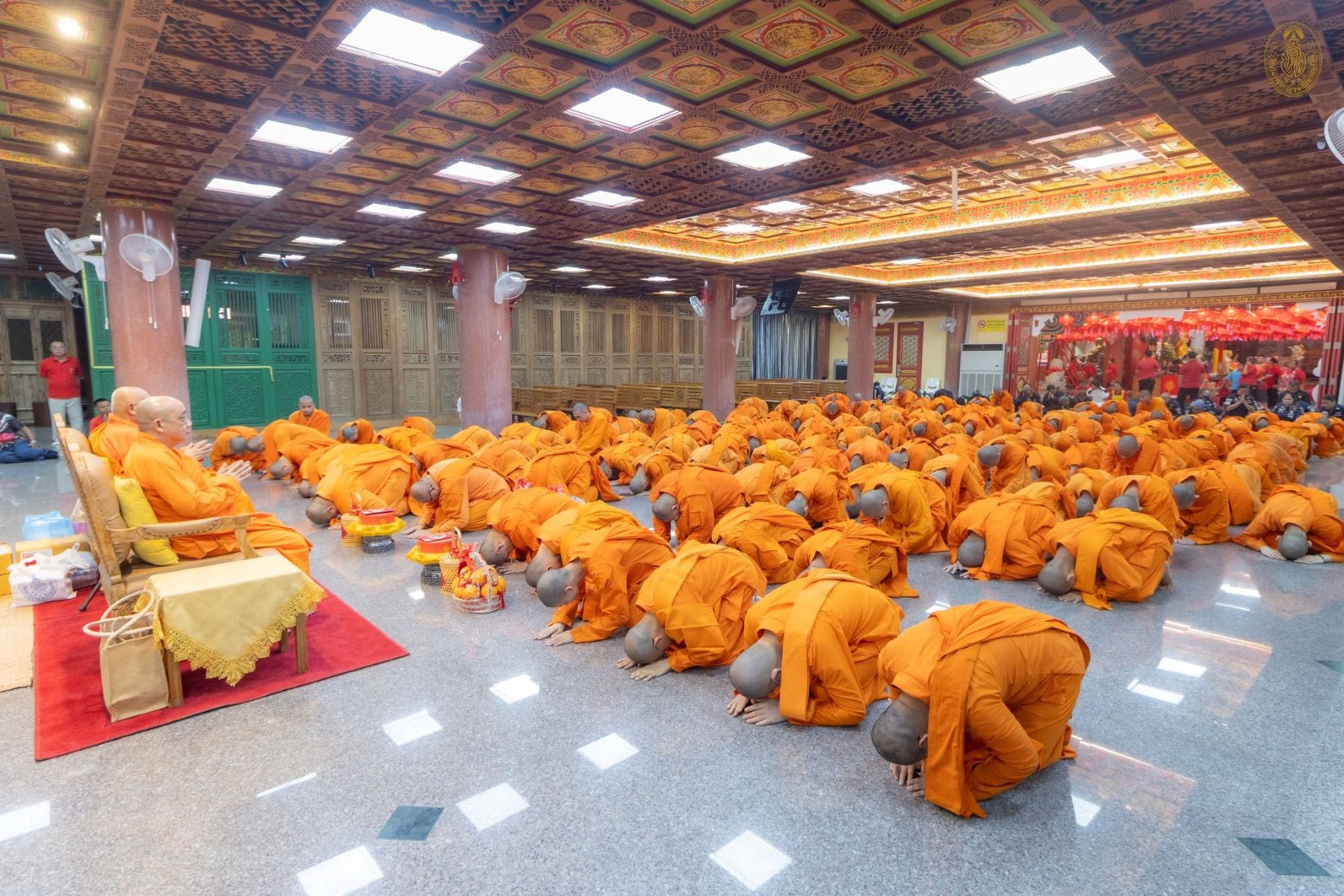 หลวงจีนสมุห์ภาณุวัฒน์, ดร. เสี่ยสก ผู้อำนวยการสถานศึกษา โรงเรียนมังกรกมลาวาสวิทยาลัย นำคณะผู้บริหาร คณะครูอาจารย์ และสามเณรนักเรียน ร่วมกันทำพิธี “ไป๋เจี๋ย” (拜正) กราบสักการะและขอพรปีใหม่จีน จาก พระเดชพระคุณ