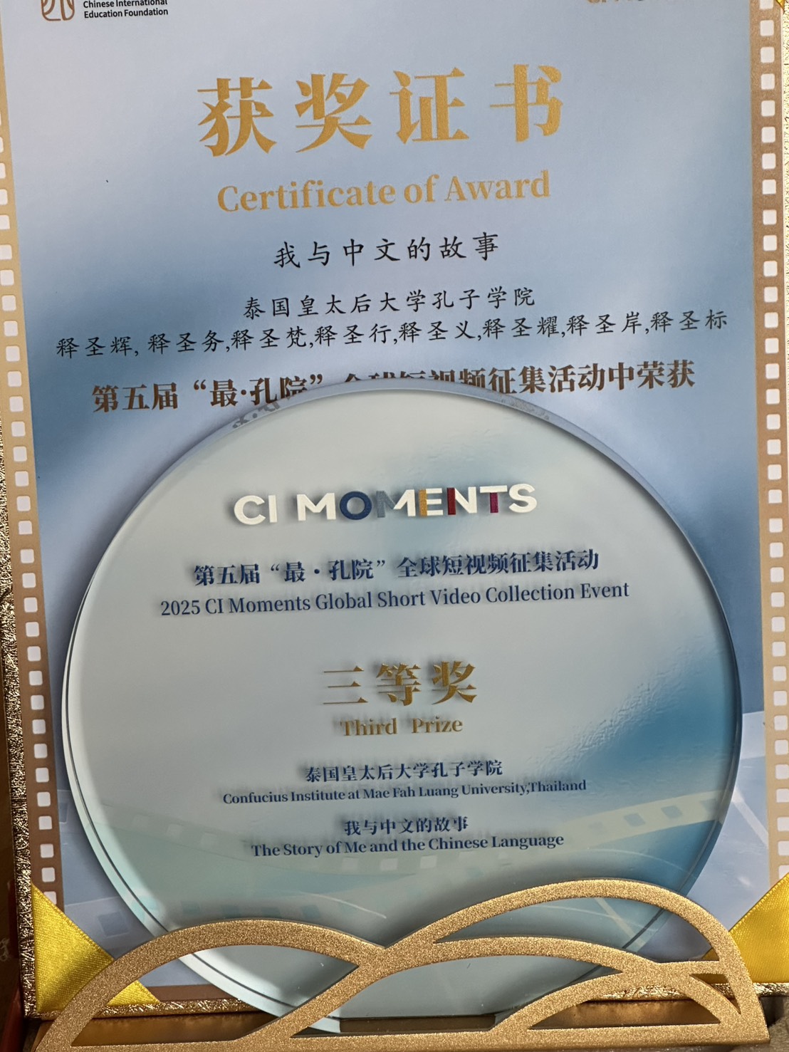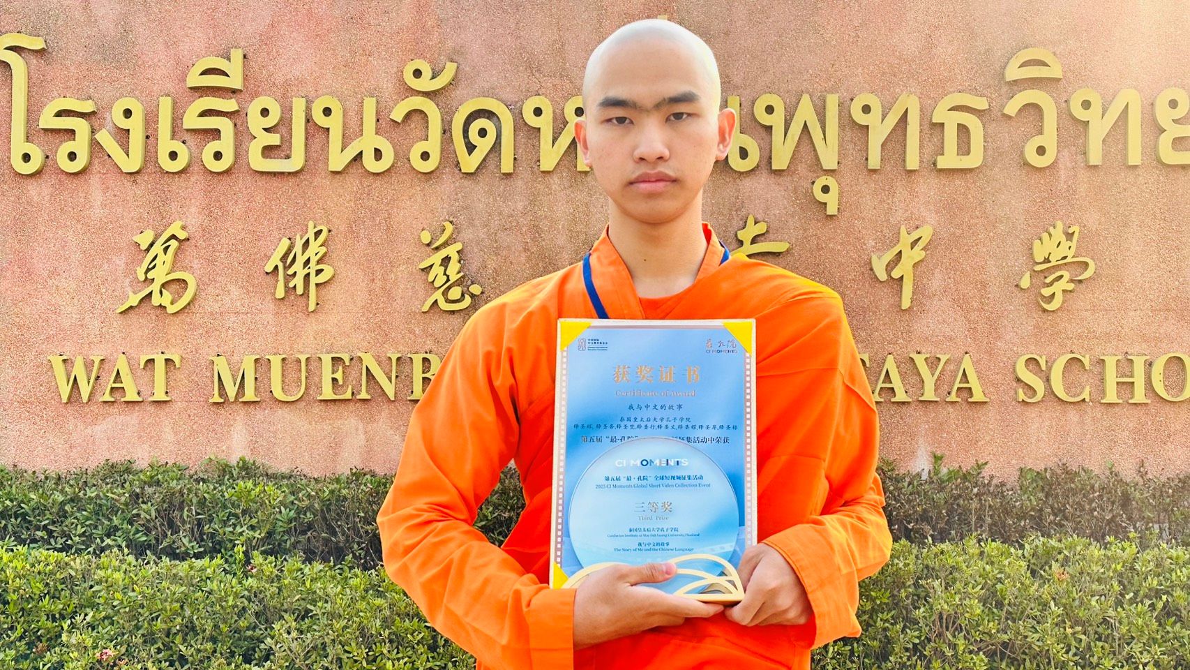 กลุ่มสาระการเรียนรู้ภาษาต่างประเทศ (ภาษาจีน) โรงเรียนวัดหมื่นพุทธวิทยา จ.เชียงราย ร่วมกับสถาบันขงจื่อ มหาวิทยาลัยแม่ฟ้าหลวง นำโดยเหล่าซือพัชรพล แซ่เหมา คัดเลือกผลงานคลิปวิดีโอสั้น “เรื่องราวของฉันกับภาษาจีน” (我与中文的故事) ของ สามเณรจักรกฤษณ์ เจี้ยนยุฮะ (圣标师)นักเรียนระดับชั้นมัธยมศึกษาปีที่ ๕ เข้าประกวดในรายการที่สุดแห่งสถาบันขงจื่อ ครั้งที่ ๕ ซึ่งจัดโดย มูลนิธิการศึกษาภาษาจีนนานาชาติ (Chinese International Education Foundation – CIEF) สาธารณรัฐประชาชนจีน และคว้ารางวัล อันดับที่ ๓ ในการประกวด The 5th “CI Moments” Global Short Video Collection Event 2025
