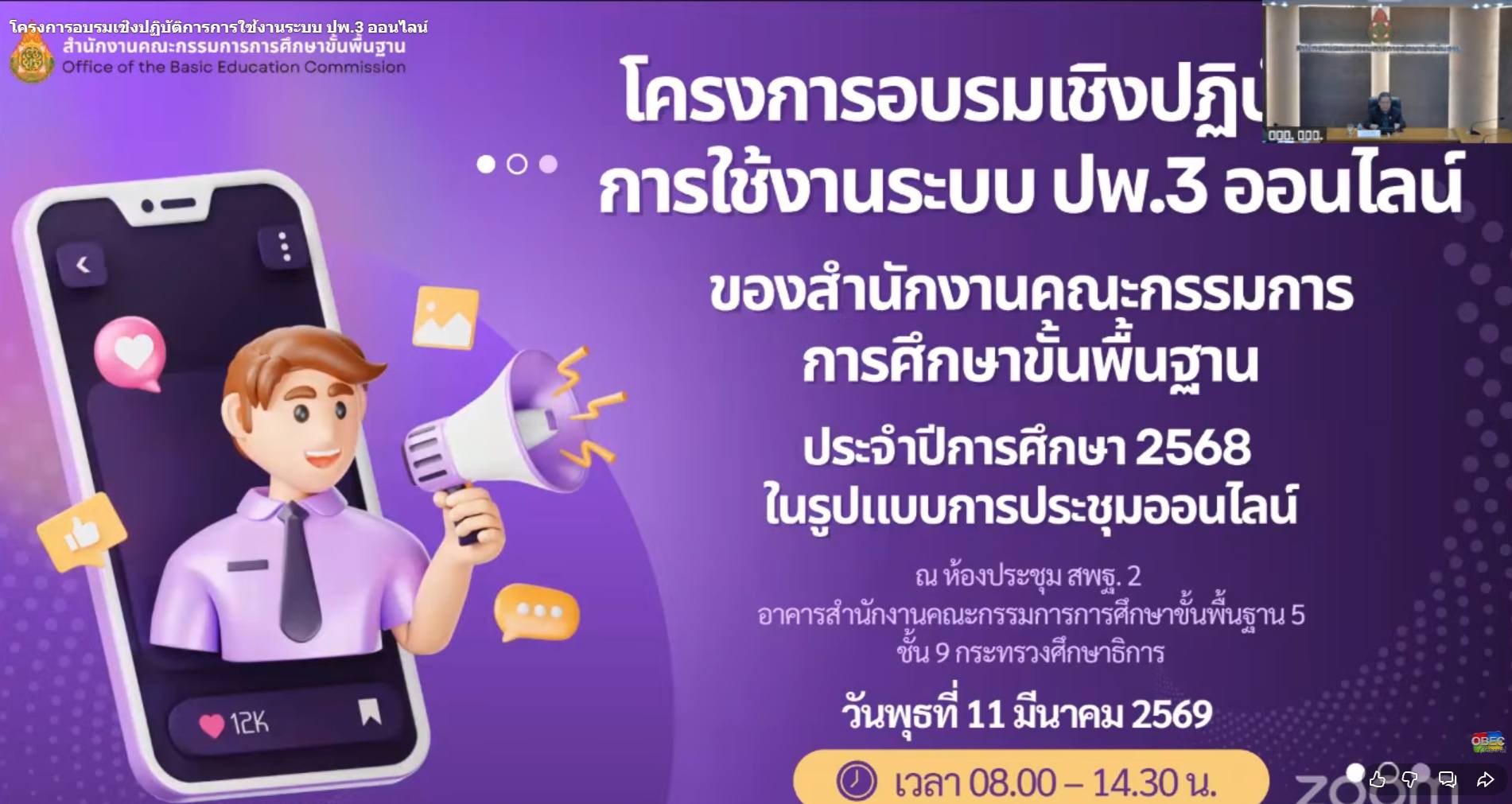 การประชุมครั้งนี้มีวัตถุประสงค์เพื่อชี้แจงแนวทางการใช้งานระบบ ปพ.๓ ออนไลน์ การบันทึกข้อมูลผลการเรียน การจัดทำเอกสารหลักฐานทางการศึกษา รวมถึงการบริหารจัดการข้อมูลนักเรียนให้เป็นไปอย่างถูกต้องตามมาตรฐานของกระทรวงศึกษาธิการ เพื่อเพิ่มประสิทธิภาพในการดำเนินงานด้านทะเบียนและวัดผลของสถานศึกษา รวมถึงสนับสนุนการใช้งานระบบสารสนเทศทางการศึกษาให้เกิดประสิทธิภาพและประโยชน์สูงสุดต่อสถานศึกษาในสังกัดต่อไป.
