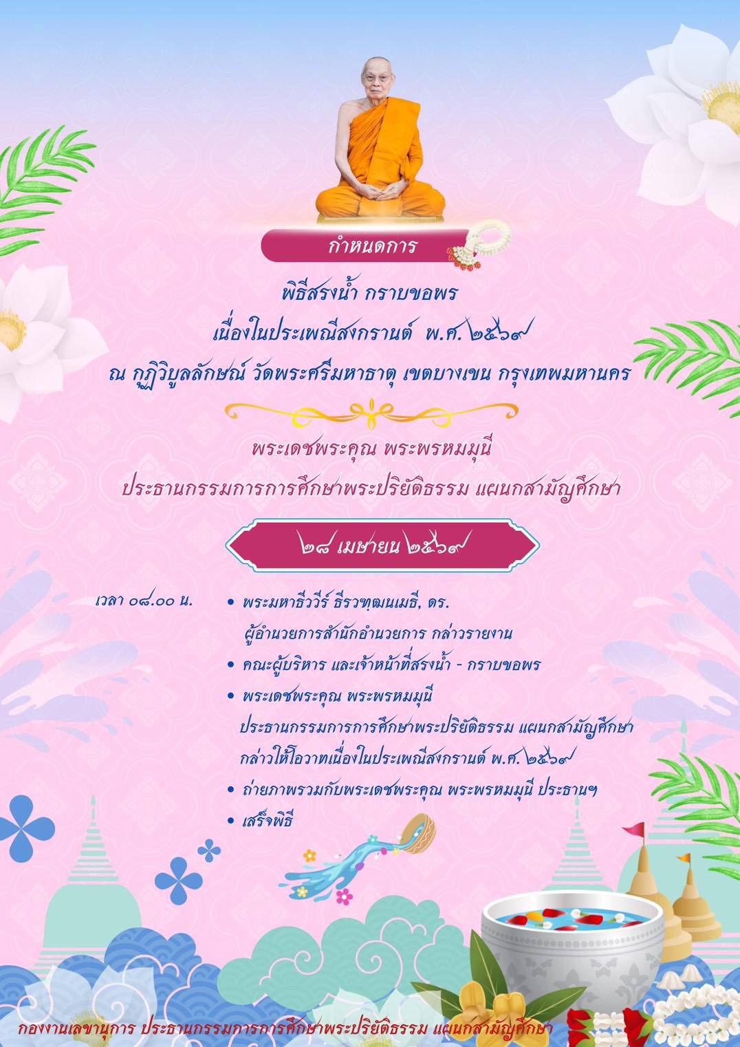 | วันอังคาร ที่ ๒๘ เมษายน ๒๕๖๙ คณะผู้บริหารสำนักงานการศึกษาพระปริยัติธรรม แผนกสามัญศึกษา (สศป.) จัดพิธีมุทิตาสรงน้ำ กราบขอพร พระเดชพระคุณ พระพรหมมุนี ประธานกรรมการ การศึกษาพระปริยัติธรรม แผนกสามัญศึกษา เนื่องในประเพณีตรุษสงกรานต์ พ.ศ. ๒๕๖๙ ณ กุฎิวิบูลลักษณ์ วัดพระศรีมหาธาตุ เขตบางเขน กรุงเทพมหานคร