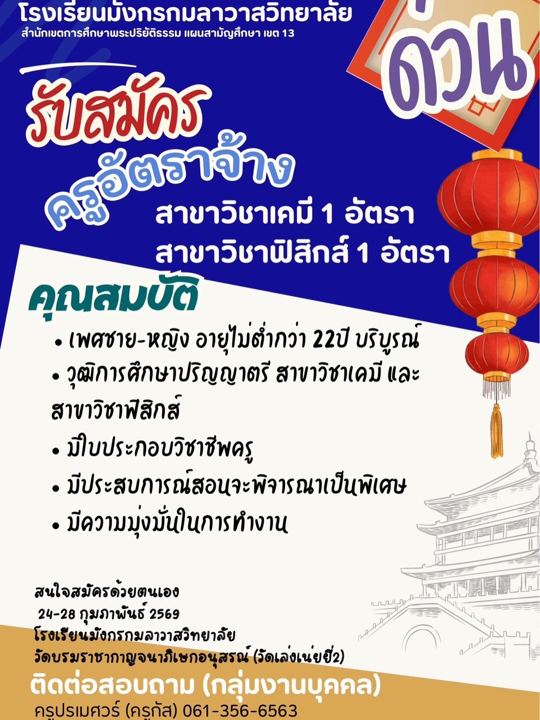 โรงเรียนมังกรกมลาวาสวิทยาลัย เปิดรับสมัครครูอัตราจ้าง 2 ตำแหน่ง