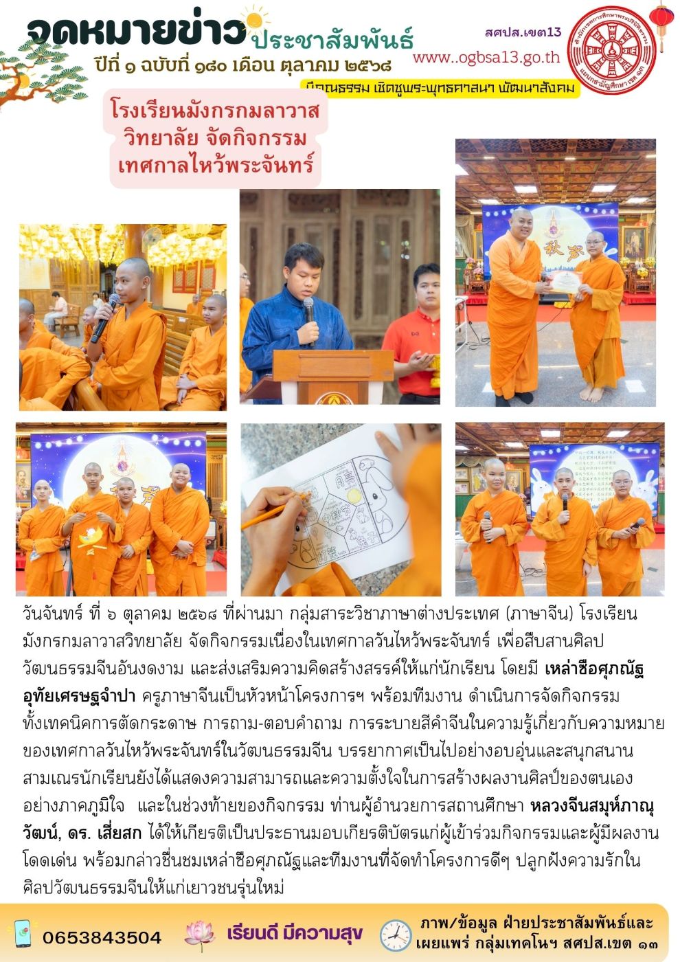 สศปส.เขต ๑๓ และโรงเรียนมังกรกมลาวาสวิทยาลัย รับรางวัล เณรกล้า โภชนาดี