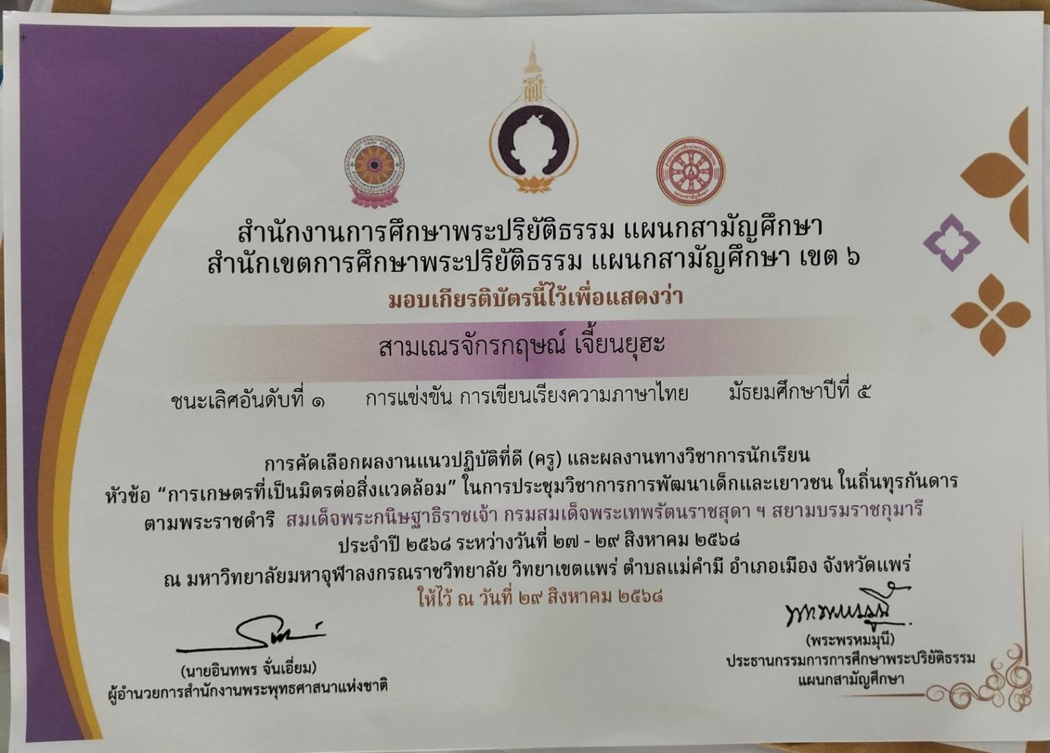 สำนักเขตการศึกษาพระปริยัติธรรม แผนกสามัญศึกษา เขต ๑๓ ขอกราบแสดงความยินดีกับสามเณรจักรกฤษ์ เจี้ยนยุฮะ ระดับชั้นมัธยมศึกษาปีที่ ๕ ที่ได้รับรางวัล ชนะเลิศอันดับ ๑ การแข่งขันเรียงความภาษาไทย ในกิจกรรมการคัดเลือกผลงานแนวปฏิบัติที่ดี และผลงานทางวิชาการนักเรียน ในหัวข้อ การเกษตรที่เป็นมิตรต่อสิ่งแวดล้อม ในการประชุมวิชาการพัฒนาเด็กและเยาวชน ในถิ่นทุรกันดารตามพระราชดำริ สมเด็จพระกนิษฐาธิราชเจ้า กรมสมเด็จพระเทพรัตนราชสุดา ฯ สยามบรมราชกุมารี ประจำปี ๒๕๖๘ ระหว่างวันที่ ๒๗-๒๙ สิงหาคม ๒๕๖๘ ณ สนามแข่งขันมหาวิทยาลัยมหาจุฬาลงกรณราชวิทยาลัย วิทยาเขตแพร่ |