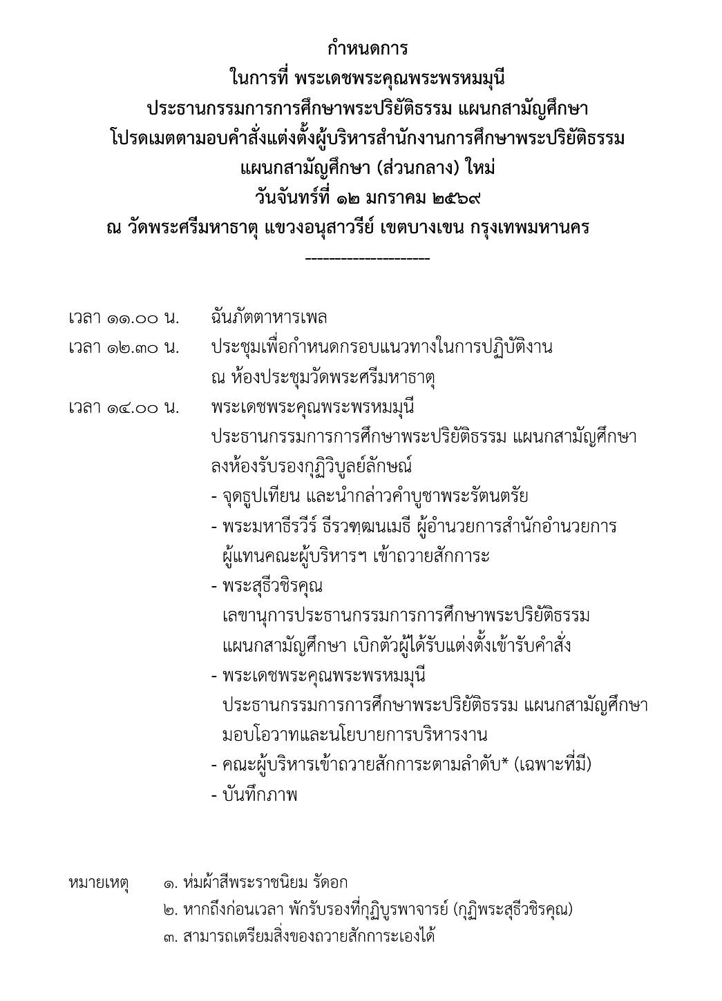 วันจันทร์ที่ ๑๒ มกราคม ๒๕๖๙ ที่ผ่านมา หลวงจีนสมุห์มงคลรัตน์, ดร. เสี่ยมุ่ย ประธานเขตการศึกษาพระปริยัติธรรม แผนกสามัญศึกษา เขต ๑๓ เข้ารับคำสั่งการแต่งตั้งให้ดำรงตำแหน่ง ผู้อำนวยการกองเทคโนโลยีสารสนเทศ สำนักงานการศึกษาพระปริยัติธรรม แผนกสามัญศึกษา (สศป.) จากพระเดชพระคุณ พระพรหมมุนี ประธานกรรมการการศึกษาพระปริยัติธรรม แผนกสามัญศึกษา