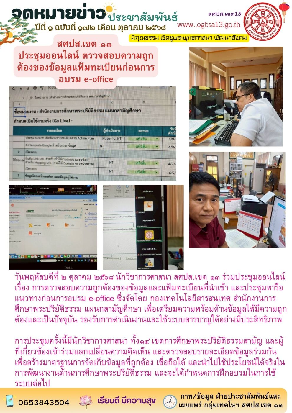 สศปส.เขต ๑๓ ประชุมออนไลน์ ตรวจสอบความถูกต้องของข้อมูลแฟ้มทะเบียนก่อนการอบรม e-office