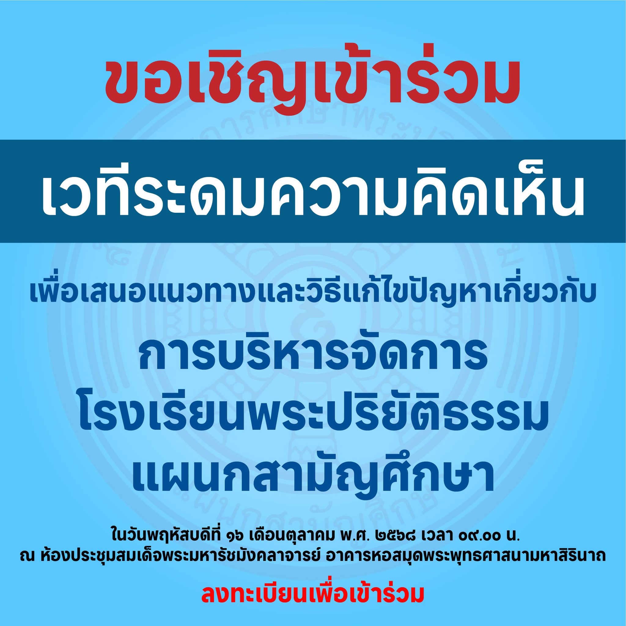 ขอเชิญเข้าร่วม “เวทีระดมความคิดเห็นเพื่อเสนอแนวทางและวิธีแก้ไขปัญหาเกี่ยวกับการบริหารจัดการโรงเรียนพระปริยัติธรรม แผนกสามัญศึกษา” ในวันพฤหัสบดีที่ ๑๖ เดือนตุลาคม พ.ศ. ๒๕๖๘ เวลา ๐๙.๐๐ น. ณ ห้องประชุมสมเด็จพระมหารัชมังคลาจารย์ อาคารหอสมุดพระพุทธศาสนามหาสิรินาถ สำนักงานการศึกษาพระปริยัติธรรม แผนกสามัญศึกษา อำเภอพุทธมณฑล จังหวัดนครปฐม